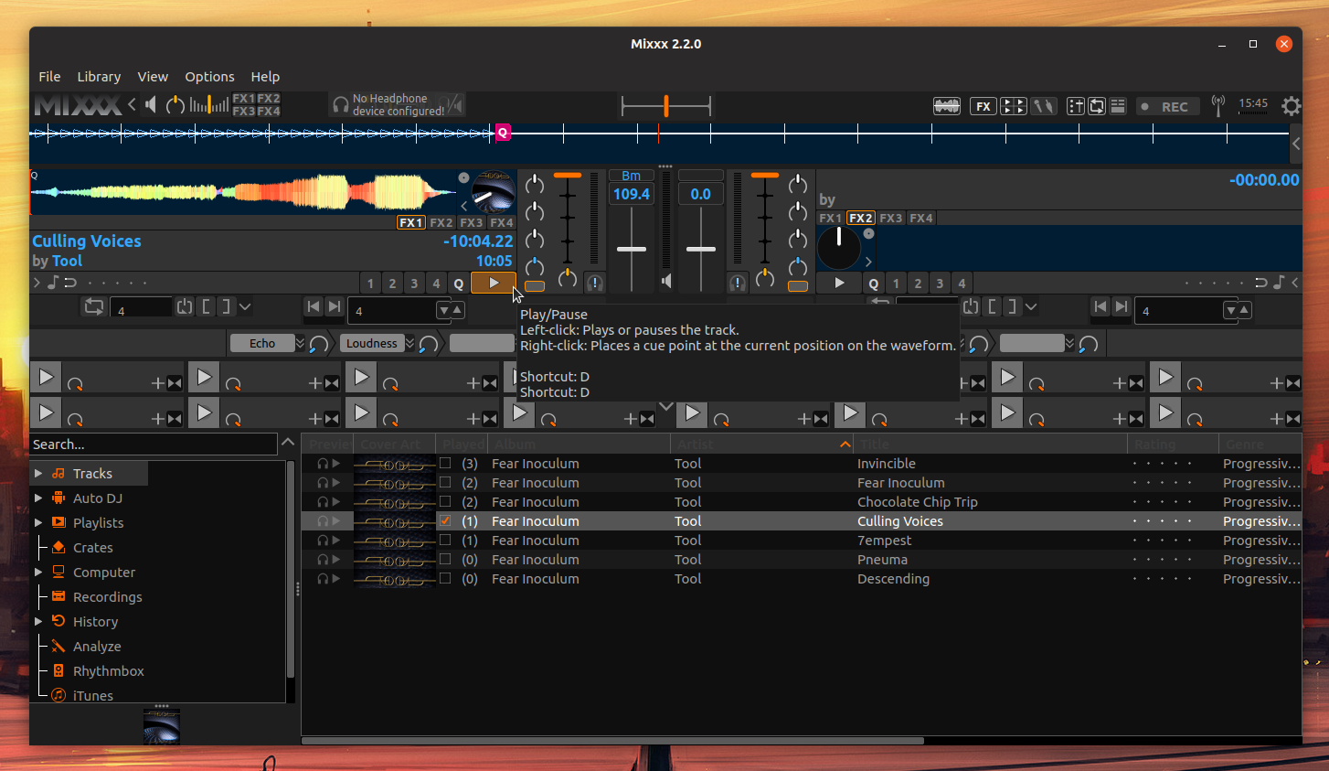 It's time to add some music to Mixx. Double click a music track to add it to deck 1, then click the play button for that deck to start playing the song: